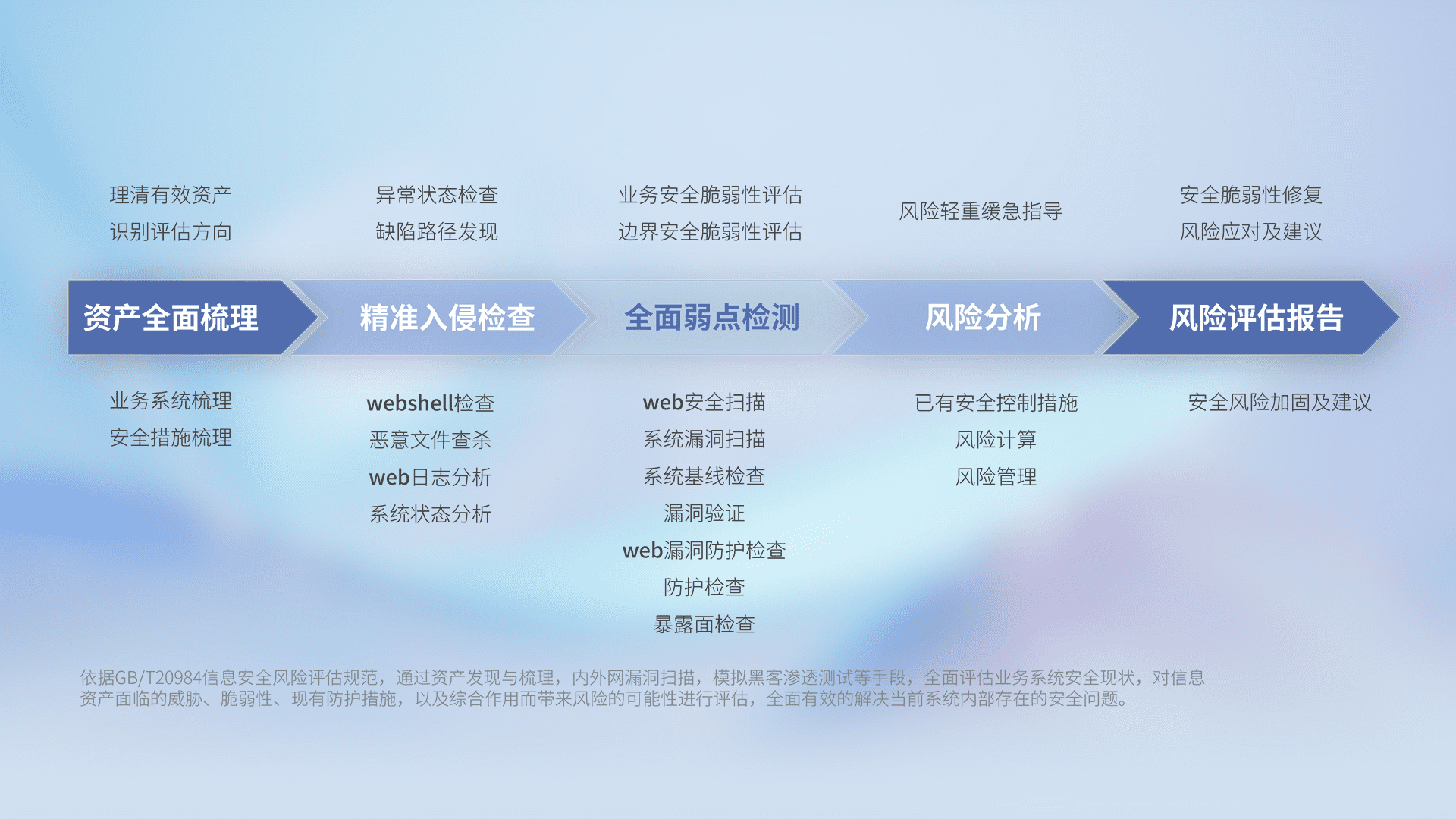 针对客户行业特性,,以专业的安全服务+多厂商联合解决方案提供专属的一站式安全管理服务,,帮助客户全面感知网络空间威胁,,,,基于识别、、、检测、、、、分析、、、防护、、监测、、、响应的服务理论模型,,从方案咨询、、、、集成交付、、、、评估验证、、优化加固、、运维运营,,致力于为客户提供完整的闭环管理式安全服务。。以实战经验为客户打造高抵御风险的安全体系,,帮助客户发现威胁、、、对抗威胁、、、、处置威胁,,,,不断积累安全对抗能力,,,,持续保障数字化安全。。